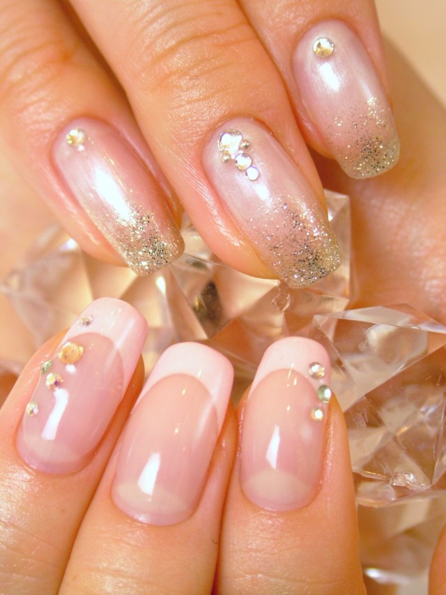 ゴージャスなビジューネイル キラキララメグラデーションネイル 細フレンチネイル ネイルルージュのデザインブログ